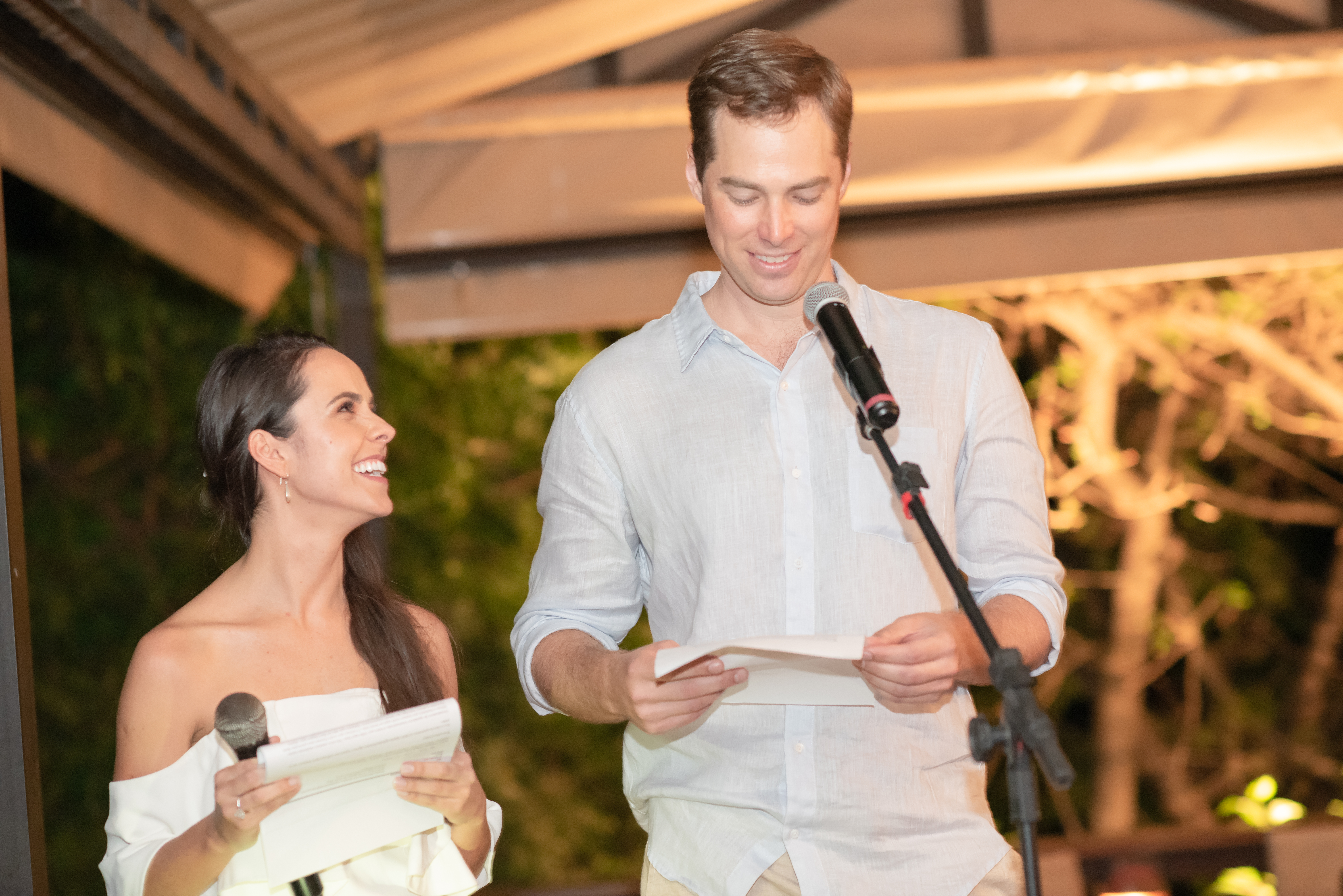“O que eu amo em você é seu sorriso lindo, bondade infinita e algum tipo de indescritível boa energia que é difícil de expressar em palavras (mas acho que todo mundo que já conheceu você entende). Enquanto crescemos longe um do outro, sinto que te conheço a vida inteira. Você me fez uma pessoa melhor do que eu era. E o mais importante, você me faz querer ser melhor. Então, prometo continuar melhorando. Prometo ser fiel, verdadeiro, aberto e honesto com você, independentemente das circunstâncias. Eu quero esse sentimento de ser só um com você. Deus, nossas testemunhas aqui hoje, e o resto do universo. Eu quero esse sentimento de alguém que eu sei que você sente. Quero que dure para sempre, nesta vida e na próxima. Eu te amo.”